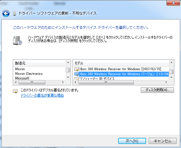 XBOX360ワイヤレスコントローラがPCで使えるレシーバー(輸入版) レビュー&使い方 【windows7】 Category:商品レビュー Date:2015年04月07日 はじめに言っておくとこの製品は純正品ではありませんしかし安い。純正品と比べると2000円もの差がある。■ちょうど1年間使用した感想■問題なく使えるが、やはり消耗品。1年目にして頻繁に1秒ほど通信が途切れるという症状がでてきました。買い替え必死ですが、安いので仕方ないと思います。数ヶ月に1回ドライバが認識しなくなり、ドライバを入れなおす必要がありました。※原因がレシーバーにあるのか確証がないため、取り消し線を付けました。■私が伝えたいこと■とにかく安くて問題なく使える(安いなら仕方ない)。ドライバーのインストールに苦戦するかもしれない(手間)。定期的にドライバを入れ直す必要がある(面倒)。寿命は1年くらいだと思った方が良い。※原因がレシーバーにあるのか確証がないため、取り消し線を付けました。■ドライバーのダウンロード方法■マイクロソフトHPからXBOX360のワイヤレスコントローラードライバをダウンロードする。レシーバーを差し込む(付属のCDは使わない)コントロールパネル → ハードウェアとサウンド → デバイスとプリンターへ進むと下の画像のように不明なデバイスが表示される 右クリック → プロパティ → タブにある「ハードウェア」 → 不明なデバイスを選択し下部の「プロパティ」 → タブにある「ドライバー」 →ドライバーの更新 → XBOX ACCESSORIESを参照する参照できない場合はコンピュータ上のデバイスドライバーの一覧から選択します(L)を選択全てのデバイスを表示(読み込みに時間がかかる)ここからMicrosoftをさがし、右欄のXBOX 360 Wireless Receiver for Windowsを選択 ドライバー更新警告が表示されますが、構わずに「はい」を押します。お疲れ様でした。インストール終了です。あとはレシーバーの通信認識ボタンを押して、コントローラー側も通信認識ボタンを押せば無事認識されます。■PR■ PR
