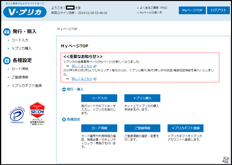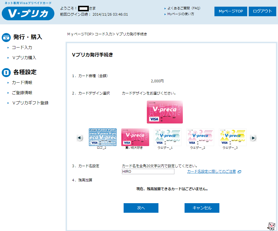 Vプリカをローソンで買ってきたから登録する! Category:未選択 Date:2015年03月29日 Vプリカ購入までの流れはこちらまずはログインですコード入力からプリペイド番号を入力(プリペイド番号は購入時に貰った紙に記載されている)カードデザインは好みのものを設定しますカード名はなんでもいいです。これがクレジットカード名義になります。カード名がHIROなら カード登録の際、姓RO 名HI といったように適当に間を空けておけば登録できます。ここ半角ではカード名を登録できないことが判明、全角で入力しました。 音声認証、SMS認証!? こんなもの前はなかったような・・・携帯は050ではじまるIP電話しか持っていないのでSMS認証は断念、電話認証にチャレンジします。電話認証にチェックし、次のページへ行くと電話認証サービスの電話番号が書いてあったので電話を掛けます。ピポパっと・・・「お電話ありがとうございます、認証が完了いたしました。ありがとうございました」おわり。簡単ですね。あとは発行すれば完了です。 PR