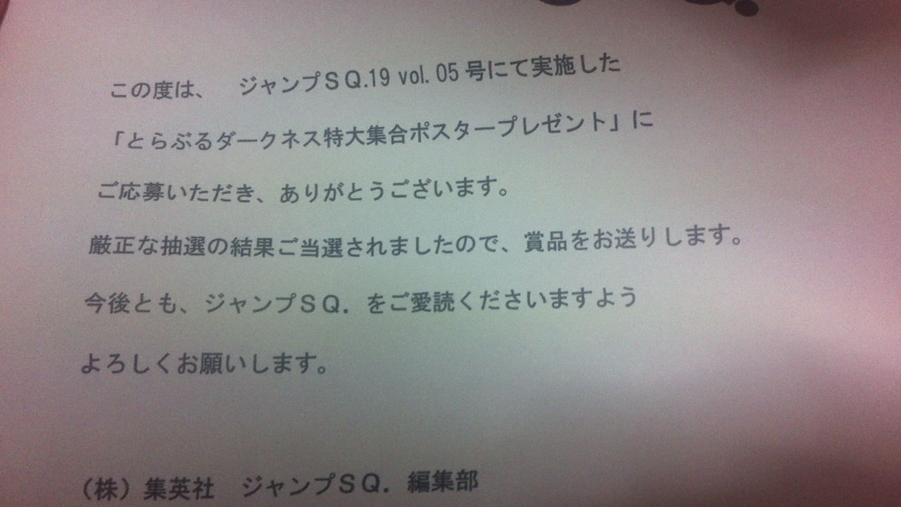 懸賞当たった! Category:生活 Date:2013年03月11日 ジャンプSQ19の懸賞に当選しました!ToLOVEるのポスターですまぁ2000名の懸賞なんですけどねそれでも懸賞に当たったことがなかなか無いので嬉しいです まぁ2000名の懸賞なんですけどねうまく撮れなかった(^_^;) PR